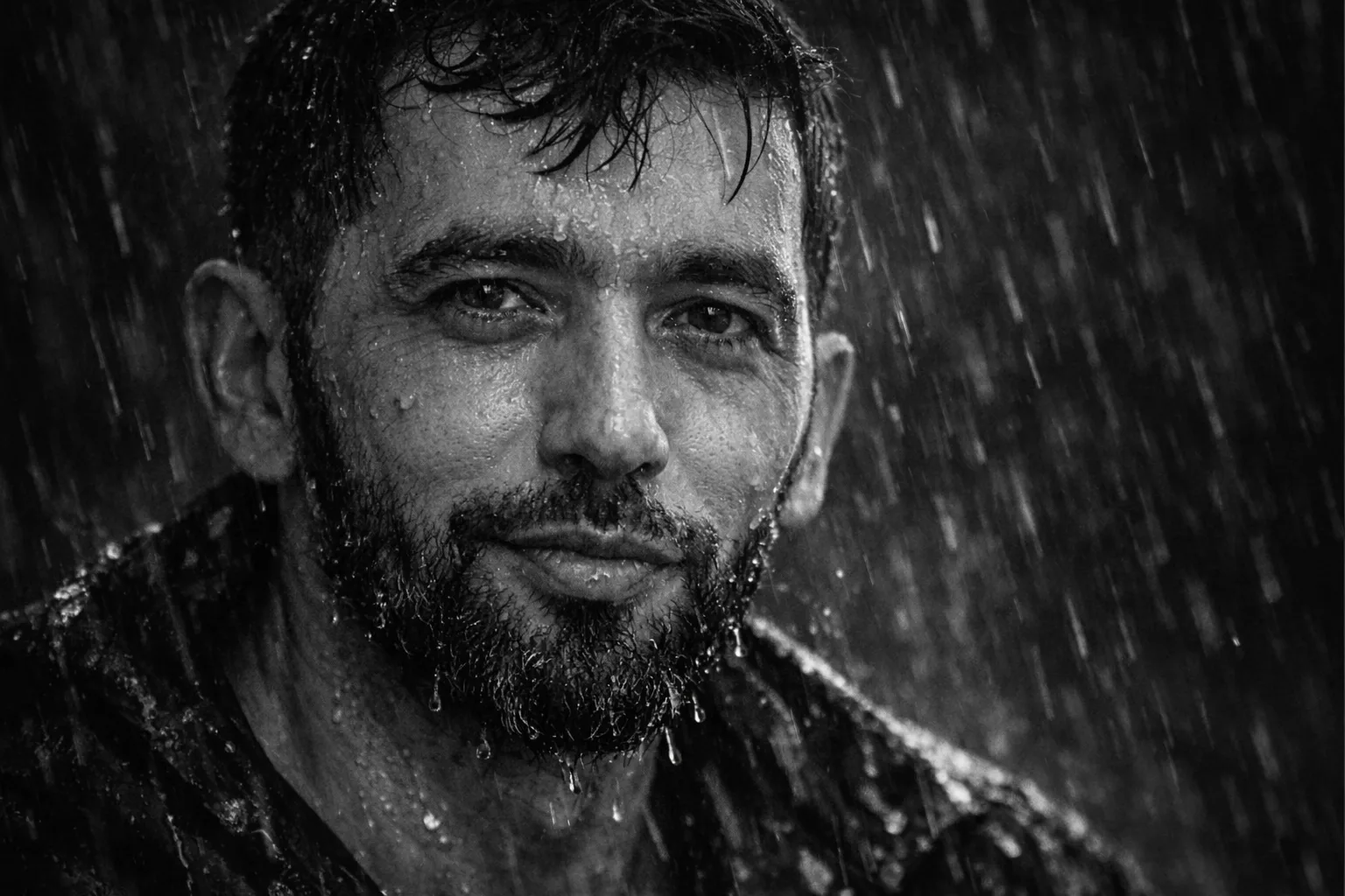 4. Impactul Ploii: Ploaia nu este doar un fundal, ci un element integral al compoziției și al mesajului. Adaugă dinamism, dramatism și o dimensiune senzorială. Picăturile de apă de pe față și barbă, precum și părul ud, sporesc realismul și subliniază condiția momentului, contribuind la o atmosferă specifică.