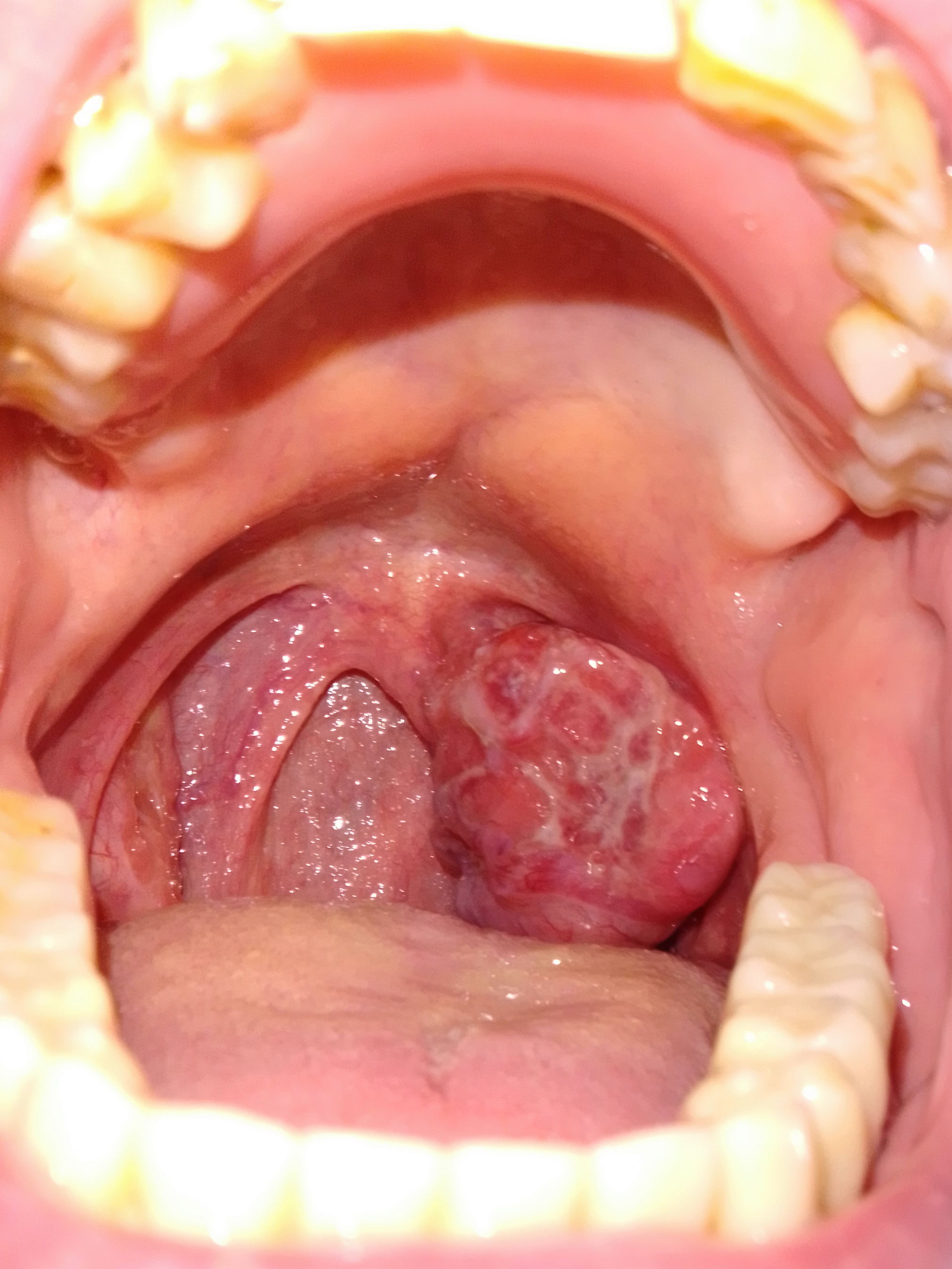 În timp ce urmam ketodieta am făcut zilnic fotografii cu telefonul la amigdala umflată (tumora) și raportând la distanța dintre dinți am urmarit cum aceasta se dezvoltă.