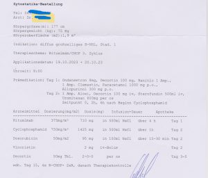 Am să pun aici și fișa de tratament de la tratamentul chemo urmat, au fost 6 ședințe 4+2, adică 4 ședințe CHOP + Rituximab iar ultimele doua ședințe doar Rituximab.
